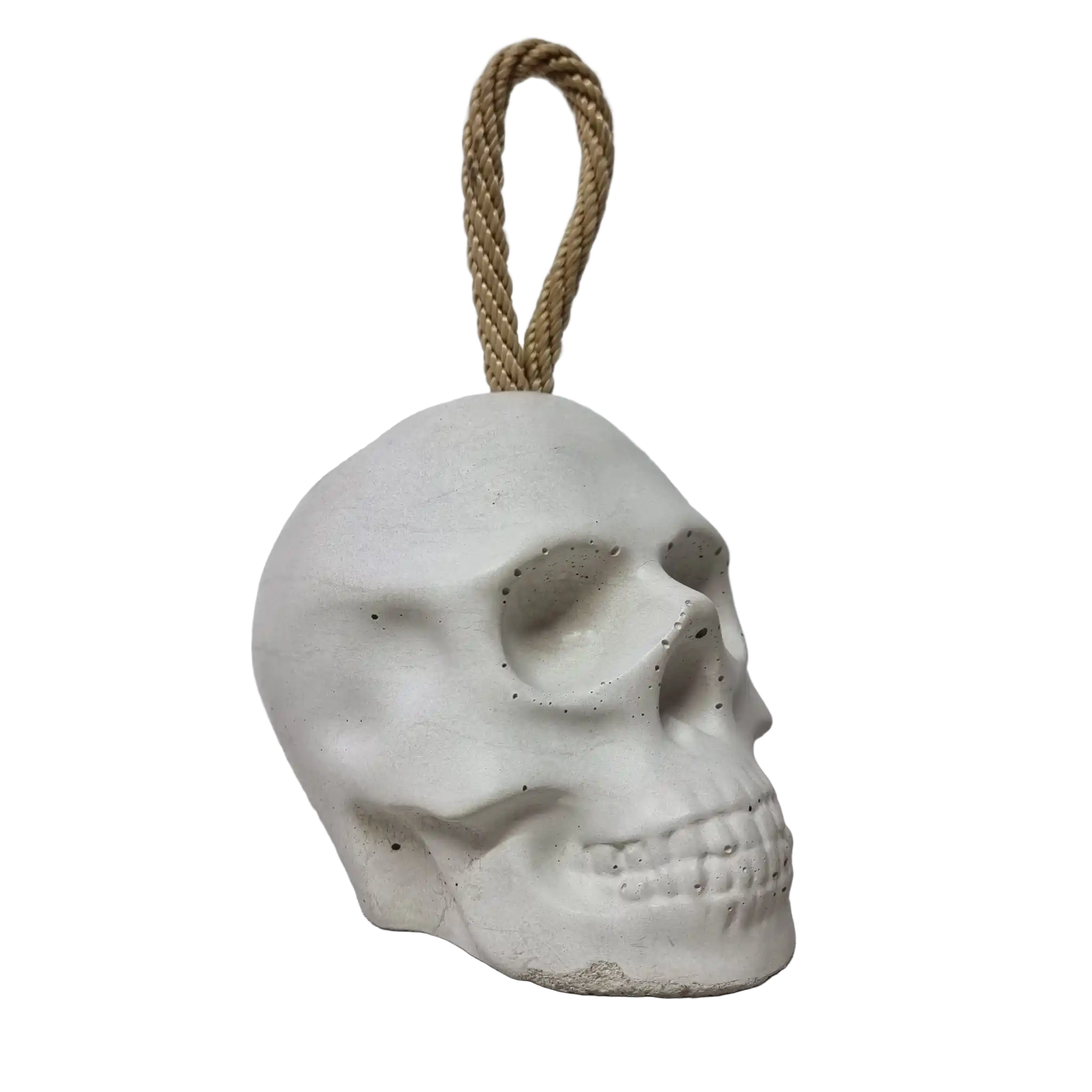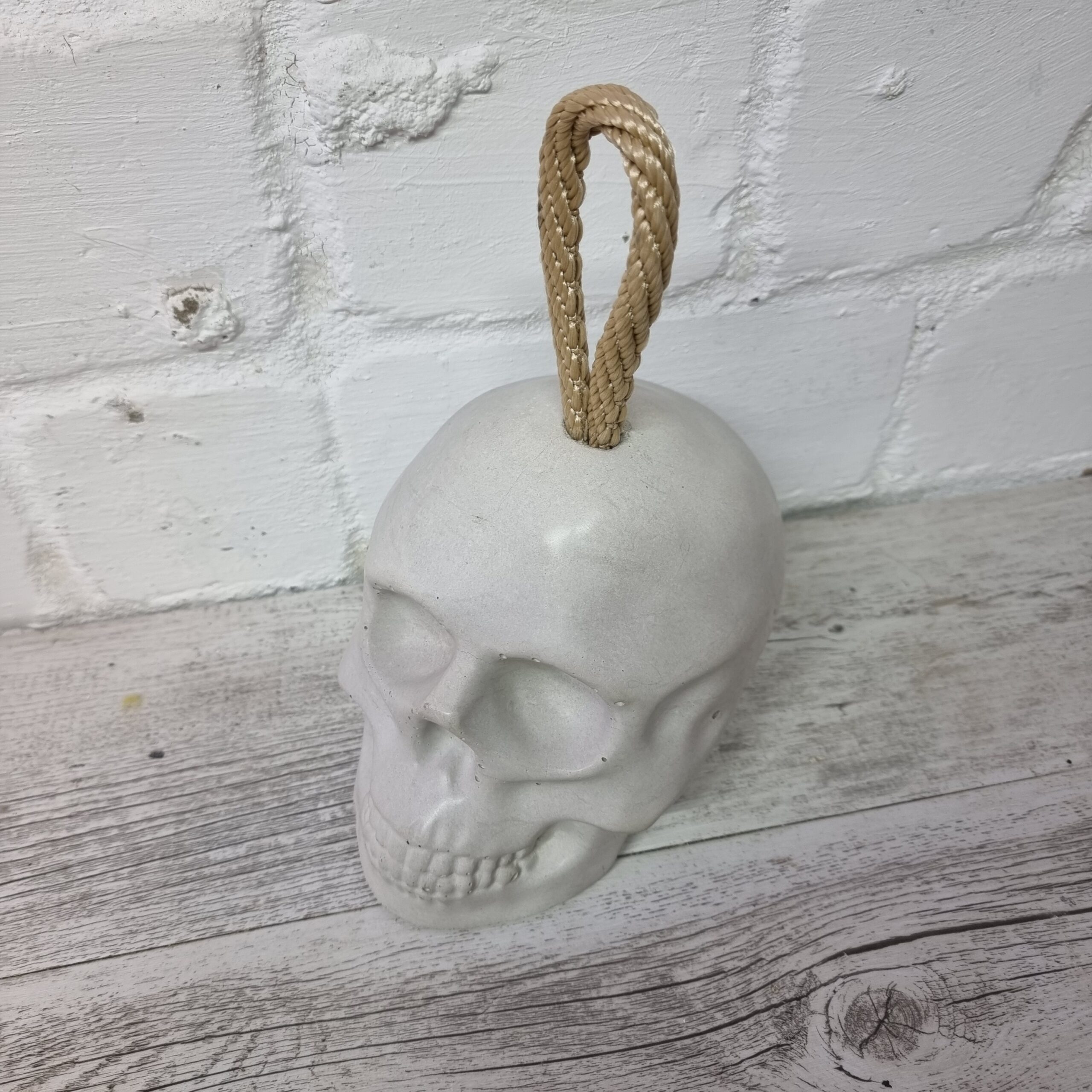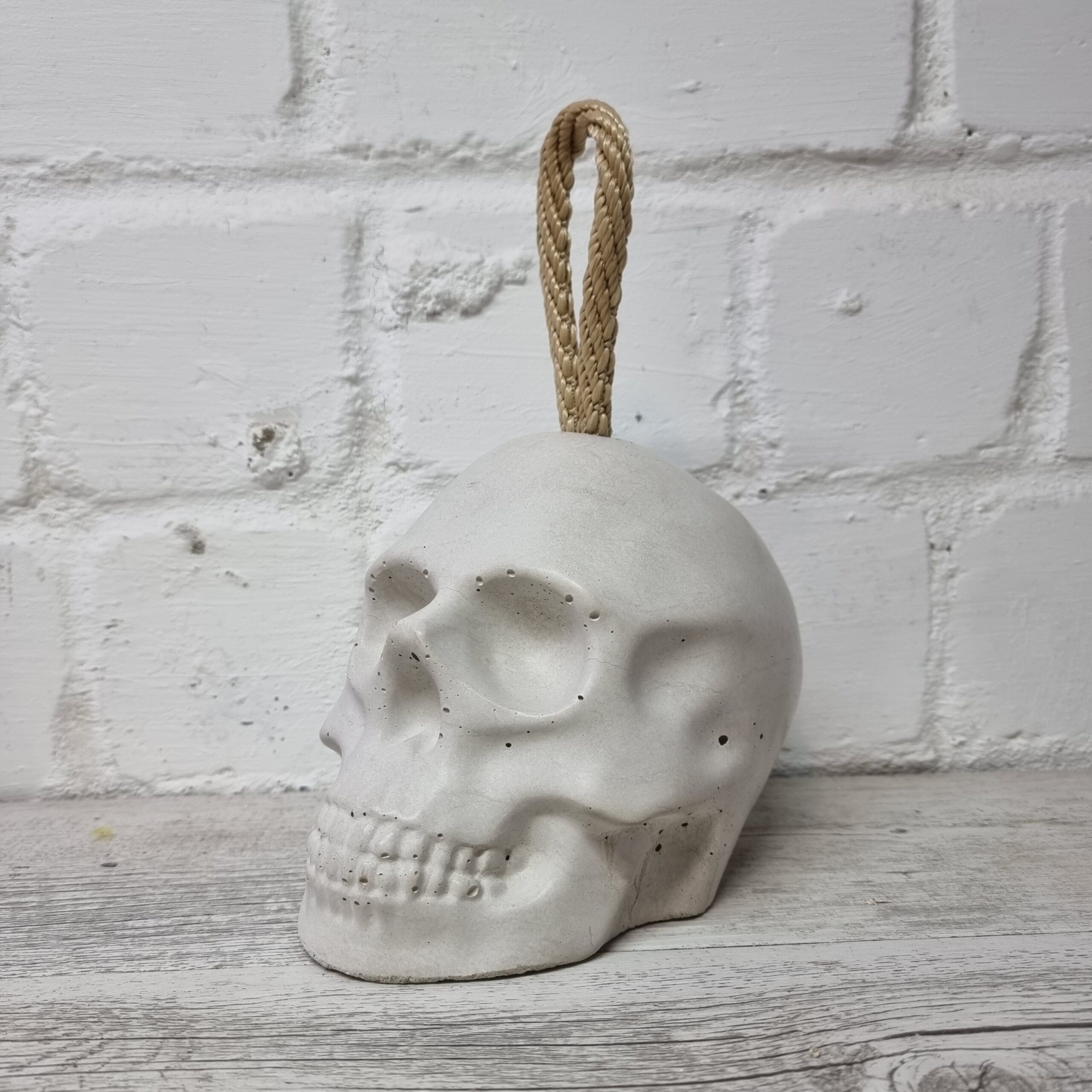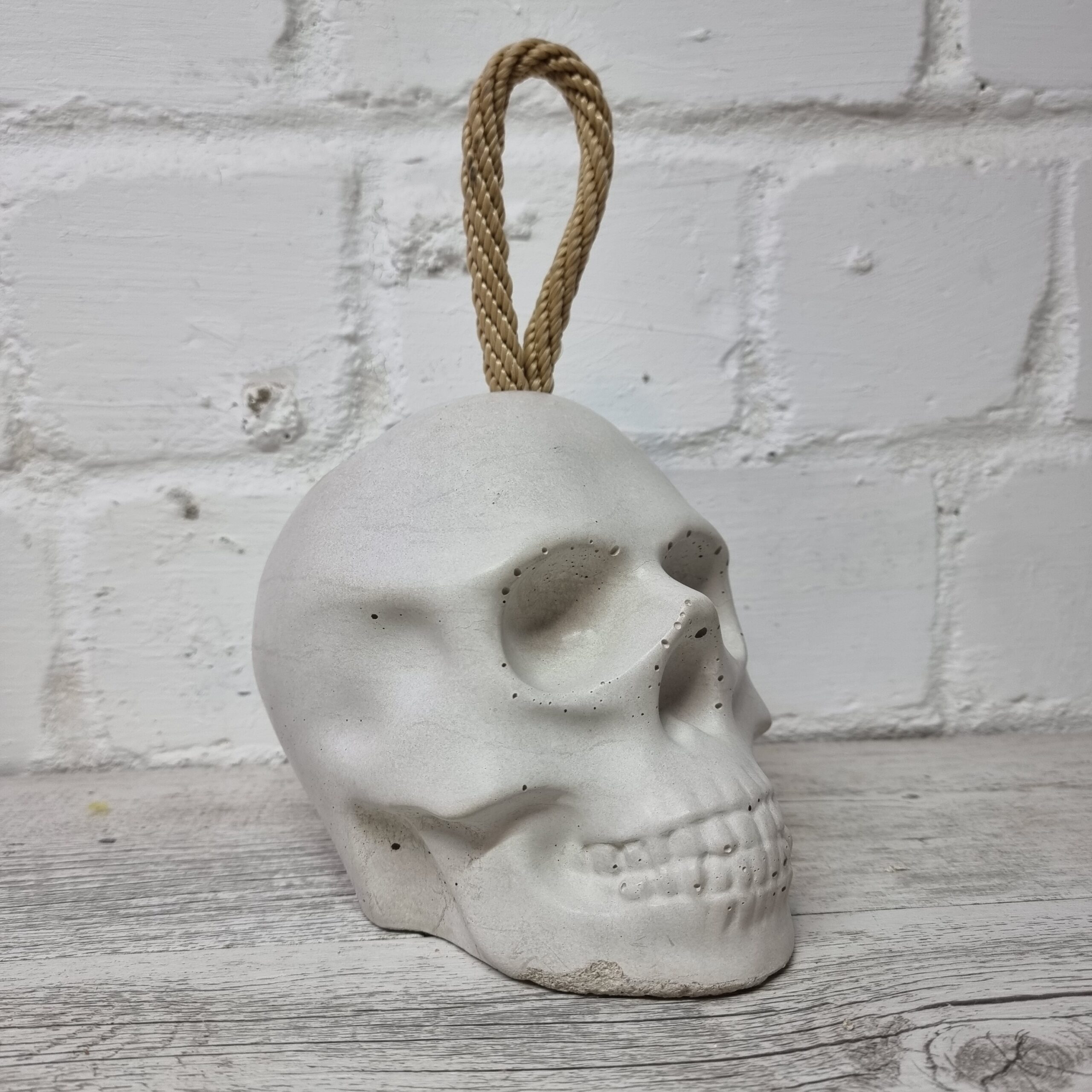 Der massive Beton Totenkopf kommt mit vollen 4 Kg daher, extrem standfest hält er stylisch deine Tür auf.