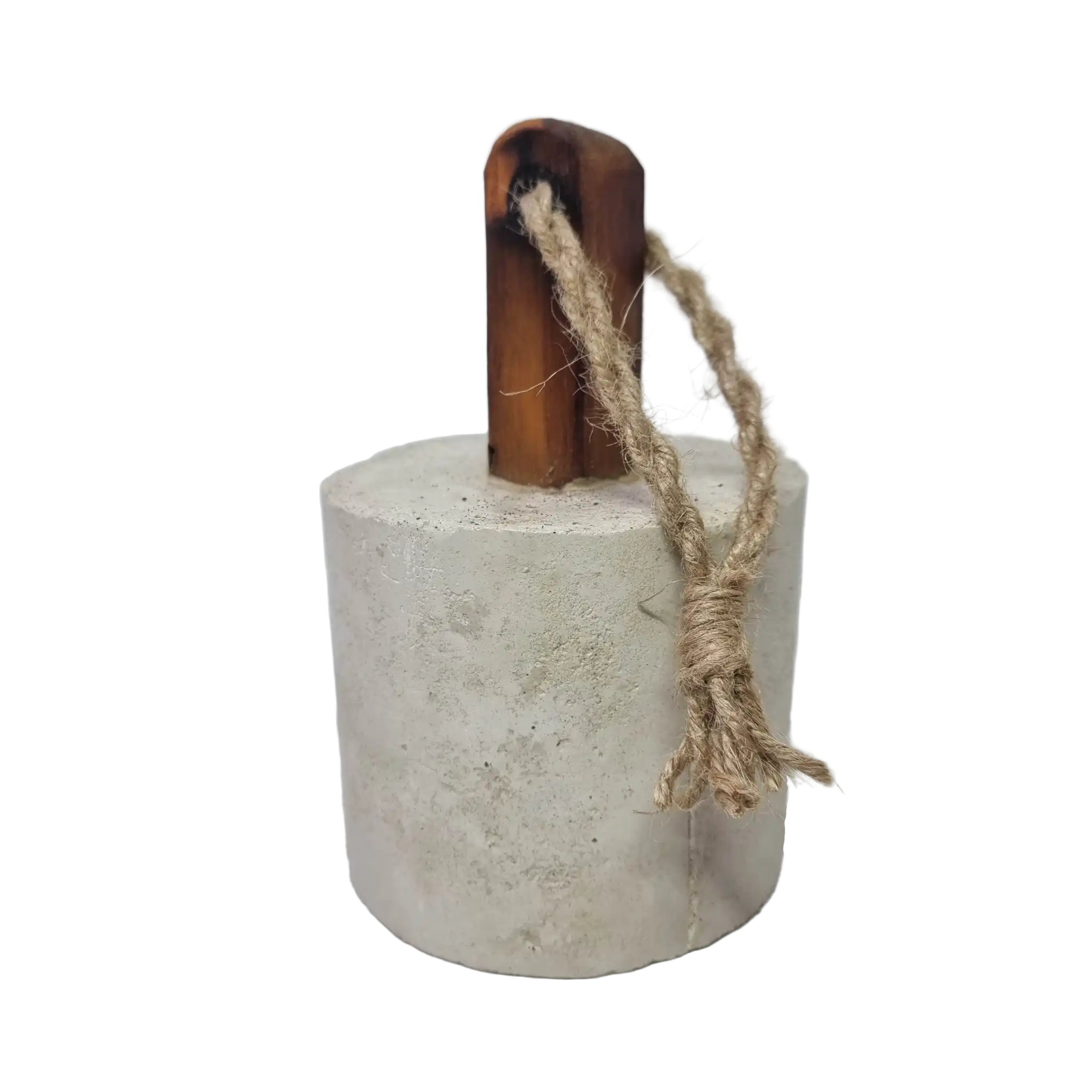 Holz und Beton im Materialmix verarbeitet, der Beton-Teil wird durch einen Holzeinsatz aus recyceltem Teakholz ergänzt, die Handschlaufe ist aus Jute.